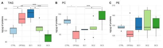 Lipid content per class (ng·µg−1 of total protein) for each scenario (SC1: embryogenesis, SC2: early development, SC3: full development, OP50(i): control nematodes fed on OP50 irradiated during the same time length as SC3). (A) Triacylglycerols (TAG) (Anova; R2 = 0.66, F(4,20) = 12.69, p = 2.66 × 10−5) (B) Phosphatidylcholine (PC) (Anova; R2 = 0.43, F(4,20) = 5.61, p = 0.0034) (C) Phosphatidylethanolamine (PE) (Anova; R2 = −0.06, F(4,20) = 0.67, p = 0.62). (All post-hoc tests are Tukey with Bonferroni adjustment; ‘*’ p-value < 0.05; ‘**’ p-value < 0.01; ‘***’ p-value < 0.001—p values from multiple comparisons are given in the text).