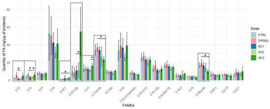 Polar lipids analysis (Figure 3B,C) showed a decrease in PC content for OP50(i) compared to controls (significant with an α risk of 10%, p = 0.053), suggesting an effect of irradiated bacteria inducing a decrease in PC content in nematodes. In contrast, there is an increase in PC content for SC3 compared to OP50(i) (p = 0.0077) and SC1 (p = 0.031). Therefore, there is an increase in PC content for SC3, and there seems to be a decrease in SC1 (compared to controls), however not significant. No significant difference was found for PE content.