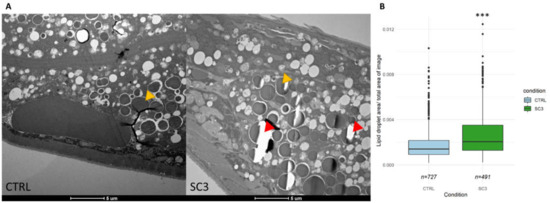 To confirm the results obtained after lipid analysis, we investigated the relative area of lipid droplets (LD) in irradiated worms (SC3) compared to controls, through TEM images. We observed that irradiated worm tissues tend to be less resistant to the slicing procedure (red arrows in Figure 5A) which is usually a result of an increased fat content. The measure of LD surface (Figure 5B) showed a significant higher lipid droplet size in irradiated nematodes (p < 2 × 10−16).
