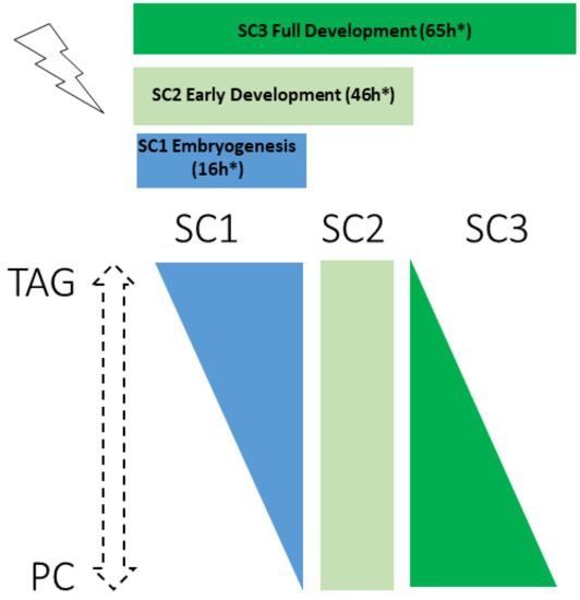 Analysis of lipid class revealed a negative correlation between TAG and PC levels and at different life stages (Figure 6). After exposure throughout embryogenesis (SC1), nematodes showed an increase in TAG content, the major form of long-term energy storage, as is also found in germline-less or germline-deficient mutants [20]. During embryogenesis, only germ cell precursors are present and in a lesser amount than somatic cells. Somatic cells have been shown to have a better repair mechanism than germ cells and thus tolerate higher levels of IR than germ cells [45,46,47]. We suggest that under the SC1 scenario, somatic cells are not affected by IR due to the relatively low total dose or time of exposure (see Table S1), but germ cells precursors are, concordant with the TAG increase also observed in germline-less glp-1 mutants. This could partly explain the 11% brood size decrease that we observe in SC1.