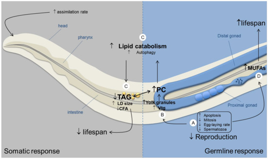 From lipid analysis, we suggest that the reduced brood size observed for nematodes exposed during embryogenesis (SC1) could be due to early unrepaired or misrepaired damages on germ cell precursors. Meanwhile, effects occurring in SC3 (i.e., more decreased brood size, egg-laying rate and sperm number decrease) are even more complex to analyze since they occur concomitantly with different phenomena highlighted through our previous studies. This enables one to draw a global map of the results including increased PC content and overexpression of vitellogenins [22], TAG catabolism, MUFA increase, CFA decrease and faster assimilation rate. The coherence of these data is presented in the following part, keeping the objective of explaining the reproductive default after full-development irradiation.