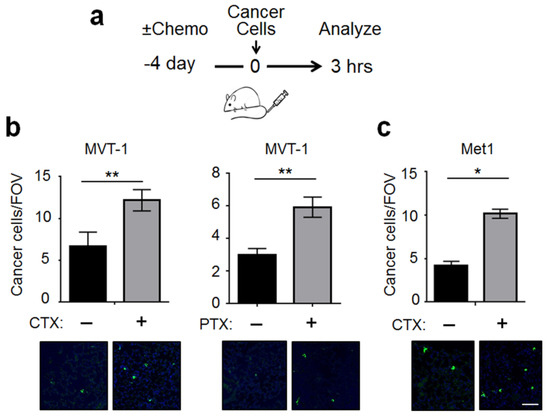 Chemotherapy pre-treatment modified the lung microenvironment to increase its adhesiveness to cancer cells. (a) A schematic of the lung colonization model with chemotherapeutic agent (+) or vehicle (−) treatment on day 4 before tail vein injection of the indicated breast cancer cells. (b) Left: Quantification of lung cancer cells per field of view (FOV) in mice pre-treated with CTX or vehicle. Right: Same as the left panel except PTX and its vehicle were used. Bottom: Representative images (showing a portion of the FOV). (c) Same as the left panel in (b) except the tGFP-Met1 breast cancer cells were used (n = 6–9 from 2–3 independent experiments). Scale bar: 50 μm. Bars indicate mean ± SEM; Student’s t test; * p < 0.05; ** p < 0.01.