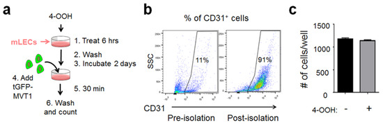 As a first step testing this hypothesis, we established an in vitro assay to examine the effect of CTX on the adhesiveness of endothelial cells (ECs). We will refer to this as the “EC adhesiveness assay”. Figure 2a shows the schematic using mouse lung ECs (mLECs). Briefly, mLECs were isolated from neonatal mice to ~90% purity (Figure 2b) using a protocol modified from [26,27] and grown to monolayer, then treated with 4-hydroperoxy-cyclophosphamide (4-OOH) (an active derivative of the prodrug CTX) for 6 h (for the rationale of this treatment period, see Materials and Methods), followed by washing and culturing for 2 days before adding cancer cells. This mimics the in vivo pre-treatment design and avoids the exposure of cancer cells to active CTX. tGFP-MVT1 breast cancer cells were co-cultured with mLECs for 30 min before washing to remove the non-adherent cells, and the remaining cancer cells were counted in a blind fashion (as detailed in Materials and Methods). As shown in Figure 2c, 4-OOH had no effect, indicating that active CTX—by itself—is not sufficient to increase the EC adhesiveness.
