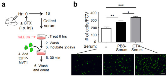 One explanation for the negative result in Figure 2c is that the in vitro condition lacks host-derived factors from mice. Therefore, we modified the protocol by injecting CTX into the mice, collecting the serum at 16 h later (Figure 3a), and using the serum (referred to as CTX-serum) in the in vitro “EC adhesiveness assay” (as in Figure 2a). This CTX-serum contains both active metabolites of CTX (from the liver) and any host-derived soluble factors (see Materials and Methods for the rationale of this 16-h design). Figure 3b shows that the CTX-serum increased the adhesiveness of mLECs, compared to the control PBS-serum. Interestingly, the PBS-serum increased mLECs adhesiveness—compared to no serum. Thus, some factors in normal mouse serum can activate mLECs to increase their adhesiveness. We will refer to those factors as the basal-factors. The further increase of mLEC adhesiveness by CTX-serum is due to host factors induced by CTX (referred to as CTX-induced factors), which can be the same as the basal-factors but at higher concentrations, or different (new) factors, or both. We repeated the experiment using human umbilical vein endothelial cells (HUVEC) and found similar results (Figure S1), indicating that the ability of CTX-serum to increase EC adhesiveness is not limited to mLECs.