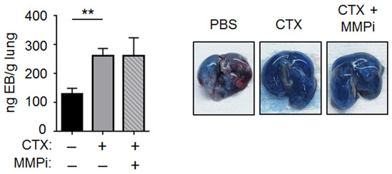 One way for CTX to increase vascular adhesiveness is to loosen the EC tight junctions and expose the basement membrane (BM). This is because BM, which is primarily composed of extracellular matrix proteins (ECMs), provides sites for cancer cells to bind and form tight adhesion [29,30]. We will refer to this as the “BM exposure” hypothesis. Since loosening the EC junction would increase blood vessel permeability, we tested this hypothesis by an Evans blue assay. We injected the blue dye intravenously at 4 days after CTX (or vehicle) treatment; 30 min later, we examined the amount of dye that had infiltrated into the lung parenchyma as an indicator for vascular permeability. As shown in Figure 5, CTX increased the intensity of Evans blue in the lung parenchyma. Previously, Liu et al. showed that ischemia increased vascular permeability in an MMP2-dependent manner [31]. Considering the functional importance of MMP-2 in our model (for CTX to increase cancer cell number at 3 h, Figure 4b), we expected that MMP-2 plays a role in the ability of CTX to increase vascular permeability. However, MMPi had no effect (Figure 5). This unexpected result can be reconciled by the differences in our model from that of Liu et al.: lung versus brain ECs (specifically ECs in the blood–brain barrier); CTX versus ischemia; in vivo versus in vitro test of MMPi. This negative result prompted us to ask, “What accounts for the functional importance of MMP-2 in our model”?