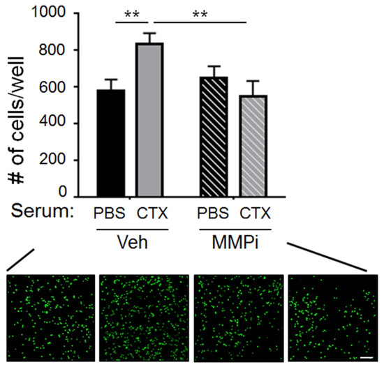 Matrigel (Corning, Tewksbury, MA, USA) was diluted in serum- and antibiotic-free DMEM to 1 mg/mL and used to coat the plate. A total of 100 μL of the diluted matrigel was deposited into each well of a 96-well plate and then incubated at 37 °C for 2 h. Afterwards, excess liquid was removed and 100 μL of DMEM or serum from mice (PBS- or CTX-serum diluted 1:100 in DMEM, a concentration determined by pilot experiments) were added to wells, with or without 50 μM MMP-2/9 inhibitor III (Millipore Sigma), and incubated for 6 h. Media/serum was removed, and 20,000 tGFP-MVT1 cell s were added in 200 μL of complete DMEM, and incubated for 30 min. Cells were then removed and plates were washed 3 times with PBS and the remaining cells imaged on a Leica microscope with a 2.5× objective. Cells were counted using FIJI’s “Analyze Particles” program with the minimum size of signals/cells set at 50 μm2.