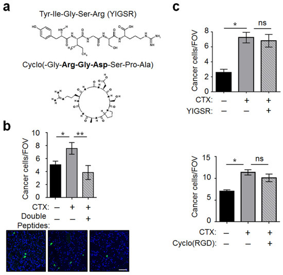 To investigate the protein domains in the BM (a host microenvironment) for cancer cells to bind, we tested two domains: the RGD domain, which is known to interact with the integrin α/β dimers on cancer cells [35,36], and the YIGSR domain, which is known to interact with the laminin receptor (LamR) on cancer cells [37]. Figure 7a shows the sequence of cyclo(RGD) and YIGSR, two peptides that have been shown to block the interaction between ECM and cancer cells [38,39], presumably by acting as competitors. We incubated cancer cells with these peptides before injection and found that they almost completely abolished the CTX effect (Figure 7b). Interestingly, neither peptide alone had any effect (Figure 7c), indicating that cancer cells can latch onto the BM by binding to either domain. Thus, blocking both of them is required to inhibit the CTX effect.