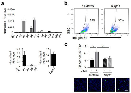 Integrin β1 knockdown in cancer cells reduced the effect of CTX. (a) mRNA levels of laminin receptor (LamR) and the indicated integrins (Itg) in tGFP-MVT1 cells were analyzed by reverse transcriptase coupled with quantitative polymerase chain reaction (RT-qPCR). Signals were normalized against glyceraldehyde 3-phosphate dehydrogenase (Gapdh) (from 4 independent experiments). (b) tGFP-MVT1 cells with Itgb1 knockdown (siItgb1) or control knockdown (siControl) were analyzed for their integrin β1 level on the cell surface by flow cytometry to estimate the knockdown efficiency. (c) tGFP-MVT1 cells with siControl or siItgb1 knockdown were injected into mice with CTX (+) or vehicle (−) pre-treatment. Lung cancer cells per FOV at 3 h post-injection were analyzed (n = 6–8 from 2 independent experiments). Bottom: Representative images. Scale bar, 50 μm. Bars indicate mean ± SEM; for panel (c), two-way ANOVA with post hoc Holm–Šídák correction; * p < 0.05.
