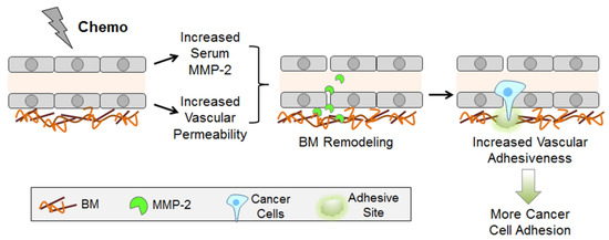In summary, we investigated the mechanisms by which CTX increases the adhesiveness of vascular wall for cancer cells to bind. Our data support a two–prong model involving vascular permeability and BM remodeling (Figure 9). These mechanistic insights provide potential future applications to reduce the detrimental effect of CTX. The targets can include MMP-2, integrin β1, or LamR. All these proteins have been the targets of investigation in clinical trials, with varying degrees of efficacy and side-effects [65,66,67]. However, those investigations were in the context of shrinking primary tumors or slowing metastasis, not as a companion treatment to reduce the deleterious effect of chemotherapy. Since chemotherapy is widely used in cancer treatment, reducing its detrimental effect will have significant impact.