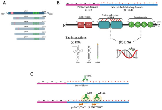 Tau protein structure and nuclear interactions. Structure of the six tau isoforms expressed in the adult human brain (A). Details of the longest isoform. It contains three major domains: an acidic N-terminal part (red), a proline-rich region (blue), and the basic microtubule-binding domain (green). The electrostatic interactions between domains allow the formation of condensed liquid tau droplets. The dotted line indicates the region where tau interacts with DNA and RNA (B). Upper line: Tau1 antibody recognizes the Ser202/Thr205 site. Lower line: The antibodies AT8 and AT100 bind with the phosphorylated sites Ser202/Thr205and Thr212/Ser214, respectively. Notice the change in the charge of the protein upon phosphorylation (C). Abbreviations: pI, regional isoelectric points; a.a., amino acids. Created with BioRender.com.