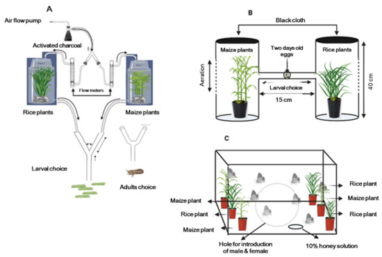 Graphical representation of choice apparatus used for larval feeding choice and adults oviposition preference behavior. (A) Y tube olfactometer set up for neonates and adults, (B) Choice chamber for neonates and (C) Cage set up for oviposition assays.