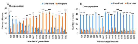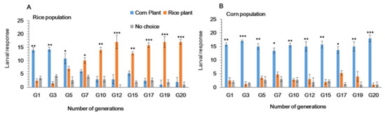 Feeding choice of first instars larvae of Spodoptera frugiperda in Y-tube, when reared on (A) rice and (B) corn plants for 20 generations. Data are means ± SE. Asterisks *, ** and *** show significant differences in different host plants (p < 0.05) using Tukey multiple comparison post hoc test at p ≤ 0.05.