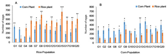 Total number of eggs laid by Spodoptera frugiperda adults on rice and corn plant when larvae reared on (A) rice and (B) corn plants for 20 generations. Data are means ± SE. Asterisks *, ** and *** show significant differences between host plants (p < 0.05) based on post hoc Tukey’s HSD test.