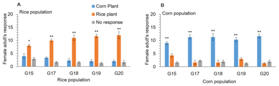 Response of Spodoptera frugiperda female to rice and corn plants in Y-tube, when reared on (A) rice and (B) corn plants for 20 generations. Data are means ± SE. Asterisks * and ** show significant differences in different host plants (p < 0.05) based on post hoc Tukey’s HSD test.