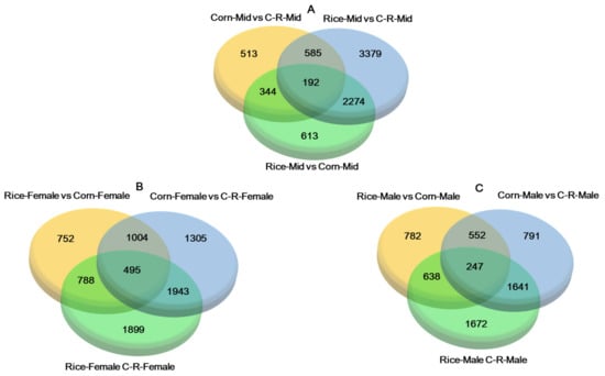 Venn diagrams depicting overlap among differentially expressed genes (log2 (FC) ≥ 1, FDR < 0.05) from pairwise comparisons among the three populations of Spodoptera frugiperda. The number of co-expressed unigenes in the Corn-midgut vs. C-R-Midgut, Rice-midgut vs. C-R-Midgut and Rice-midgut vs. Corn-Midgut (A), Rice-female vs. Corn-female, Corn-female vs. C-R-female (After 20 generation the corn population was fed on rice for one generation (C-R-female)) and Rice-female vs. C-R-female (B) and Rice-male vs. Corn-male, Corn-male vs. C-R-male and Rice-male vs. C-R-male antennae (C).