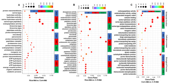Gene Ontology (GO) classification of transcripts. The number of significantly up- and down-regulated unigenes are assigned into three main ontologies: biological process, cellular component and molecular function in the Rice-Mid vs. Corn-Mid (A), Rice-Mid vs. C-R-Mid (B) and Corn-Mid vs. C-R-Mid (C) (After 20 generation of selection the corn population was fed on rice for one generation (C-R-midgut)) of Spodoptera frugiperda when reared on corn and rice plants.