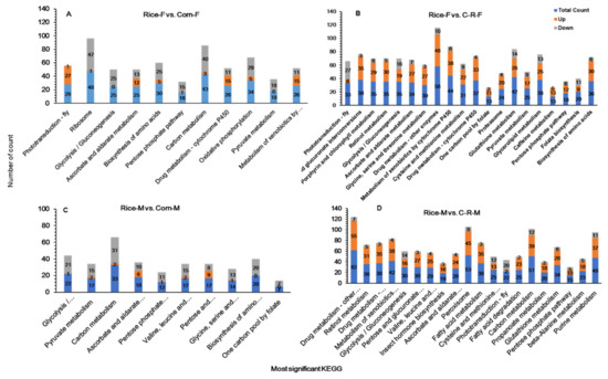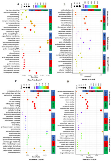 A total of 7509 unigenes were differentially expressed in Rice-Female vs. Corn-Female group and classified into the three main ontologies: biological process was the largest class with a total of 3840 (51.1%) unigenes; 1446 (19.3%) up and 2394 (31.9%) downregulated; followed by molecular function with 2908 (38.7%) unigenes and cellular component class with 761 (10.1%) up or down regulated (Figure 9A). The majority of DEGs in the GO analysis that were enriched related to biological process such as carbohydrate metabolism, drug metabolism and nucleoside triphosphate metabolism. Similarly, the two subcategories of DEGs most enriched in molecular function were related to cofactor binding and ion transmembrane transporter activity (Figure 9A). Similarly, of the 12,276 unigenes up or down regulated in Rice-Female vs. C-R-Female, the largest class was related to molecular function (52%) such as cofactor binding and odorant binding with 3315 (27%) up and 3069 (25%) down-regulated, followed by biological process with a total of 4743 (38.6%) significant DEGs related to carbohydrate metabolic process 1149 (9.4%) unigenes in the cellular component class (Figure 9B). In Rice-Male vs. Corn-Male comparisons 4777 unigenes were up or down regulated and again biological process was the most influenced class with a total of 2426 (50.8%) unigenes of which 798 (16.7%) were up-regulated and 1628 (34.1%) down-regulated and were related to carbohydrate metabolic (GO:0005975) and carbohydrate derivative metabolic process (GO:1901135). Of 2050 (42.91%) unigenese related to molecular function 894 (18.7%) were up- and 1156 (24.3%) down-regulated with cofactor binding containing the most significant DEGs. Cellular component was the least modified class with 31 (6.3%) (Figure 9C). A similar trend was observed in Rice-Male vs. C-R-Male (Figure 9D).