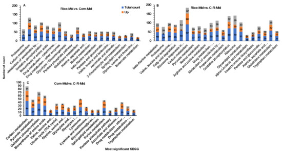 Enriched KEGG pathways for up and down regulated DEGs and the ratio of the DEG number to the total gene number in a certain pathway in the Rice-Mid vs. Corn-Mid (A), Rice-Mid vs. C-R-Mid (B), corn-Mid vs. C-R-Mid (C) (After 20 generation of selection the corn population was fed on rice for one generation (C-R-midgut) of Spodoptera frugiperda when reared on corn and rice plants for 20 generations.
