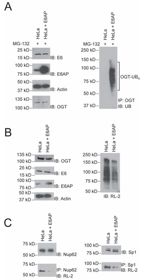 The following antibodies were purchased from Santa Cruz Biotechnology (Dallas, TX, USA): anti-OGT (sc-74546), anti-E6AP (sc-166689), anti-hemagglutinin (HA) (sc-7392), anti-actin (sc-8432), anti-UB (sc-8017), and mouse anti-rabbit IgG-HRP (sc-2357). Goat anti-mouse IgG secondary antibody (31438) was from Thermo Fisher Scientific (Waltham, MA, USA). Anti-FLAG (M2) antibody (F3165) was from Sigma-Aldrich (Burlington, MA, USA). Anti-Nup62 antibody (NBP1-31381) was from Novus Biologicals (Centennial, CO, USA). Anti-Sp1 antibody (07-645) was from EMD Millipore (Burlington, MA, USA). Anti-O-GlcNAc RL2 antibody (2739) was from Abcam (Cambridge, MA, USA). E6 protein of human papillomavirus type 16 was from Boston Biochem (Cambridge, MA, USA).