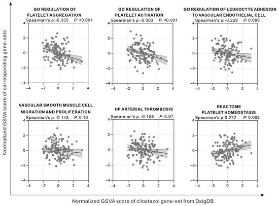 Clinical cardiovascular patient sample data were obtained from NCBI’s Gene Expression Omnibus GSE19151 [40]. Cilostazol-related gene sets were downloaded from DsigDB, mainly obtained using the Biomedical Object Search System (BOSS) combined with a text-mining approach [41]. The gene sets “GO REGULATION OF PLATELET AGGREGATION”, “GO REGULATION OF PLATELET ACTIVATION”, “GO REGULATION OF LEUKOCYTE ADHESION TO VASCULAR ENDOTHELIAL CELL” were extracted from the Gene Ontology Molecular Signature Database [42,43]. “VASCULAR SMOOTH MUSCLE CELL MIGRATION AND PROLIFERATION” was extracted from Elsevier Pathway Collection in Enrichr [44]. “HP ARTERIAL THROMBOSIS” was from Human Phenotype Ontology [45], and “REACTOME PLATELET HOMEOSTASIS” was from the Reactome Project [46]. Briefly, the GSE19151 data were calculated using the GSVA package in R, combining the above gene sets with default settings. The results were pre-normalized and analyzed using Spearman’s correlation; then they were plotted with GraphPAD Prism® software, version 6 (GraphPad Software Inc., San Diego, CA, USA).