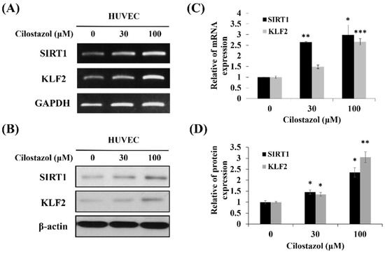 Cilostazol upregulates the expression of Krüppel-like factor 2 (KLF2). The HUVECs were incubated with 0, 30, and 100 μM cilostazol for 24 h. The mRNA expression of KLF2 and silent information regulator transcript-1 (SIRT1) in endothelial cells was assessed using (A) PCR and (B) quantitative real-time PCR, respectively. Additionally, protein expression was verified using (C,D) Western blot. Data are expressed as mean ± SEM. * p < 0.05, ** p < 0.01 and *** p < 0.001 vs. control.