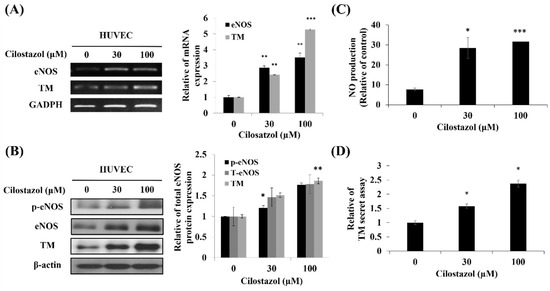 Cilostazol increases endothelial nitric oxide synthase (eNOS) expression and thrombomodulin (TM) at the RNA and protein levels. The HUVECs were incubated with cilostazol (0, 30, or 100 µM) for 24 h. The expression of eNOS and TM on mRNA and p-eNOS, total eNOS, and TM on protein expression levels was assessed using (A) PCR and (B) Western blot, respectively. (C) The nitric oxide (NO) production and (D) TM secretion was detected using flow cytometry with 4,5-diaminofluorescein and ELISA, respectively. Data are expressed as mean ± SD of experiments conducted in triplicate. * p < 0.05, ** p < 0.01, and *** p < 0.001 compared to the untreated group.