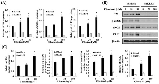 Knockdown of KLF2 decreases eNOS and TM expression in cilostazol-treated endothelial cells. Silence KLF2 expression by transfecting HUVECs with short hairpin KLF2 (shKLF2) and a mock vector (shMock) was used as a control. Transfected cells were incubated with 0, 30, or 100 µM cilostazol for 24 h. (A) Real-time PCR and (B) Western blot were used to identify p-eNOS, total eNOS, and TM in either RNA or protein expression, respectively. (C) Reflective densitometry of Western blot. Data are presented as mean ± SEM, n = 3. * p < 0.05 compared to the untreated group.