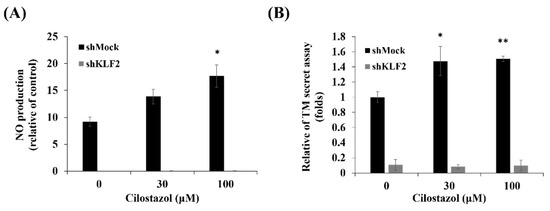 The NO production and TM secretion on cilostazol-treated shKLF2 cells. The HUVECs, shMock, or shKLF2 were treated with cilostazol for 24 h. (A) The NO production was measured by 4,5-diaminofluorescein using flow cytometry. (B) TM secretion was assessed by ELISA. Data are presented as mean ± SEM, n = 3. * p < 0.05 and ** p < 0.01 compared to the untreated group.