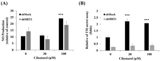 The NO production and TM secretion on cilostazol-treated shSIRT1 cells. HUVECs, shMock, or shSIRT1 were cultured with 0, 30, and 100 μM cilostazol for 24 h. (A) The NO production of cells was stained with 4,5-diaminofluorescein and analyzed using flow cytometry. (B) The TM secretion was measured using ELISA. Data are presented as mean ± SEM, n = 3. *** p < 0.001 compared to the untreated group.
