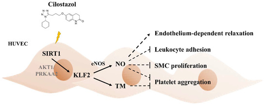 SIRT1, an NAD+-dependent histone deacetylase, involves cell cycle regulation, senescence, metabolism, and longevity. In numerous studies, the role of SIRT1 in endothelial cell function appears to coordinate with KLF2 expression [8,33]. Wu et al. reported particulate matter air pollution exposure decreased lung KLF2 and TM expression in mice models, which could be reversed via Sirt1-gene delivery [33]. Gracia-Sancho et al. demonstrated that resveratrol activates SIRT1 and induces KLF2 expression, conferring an increase in eNOS expression in cultured endothelial cells [8]. To further explore the relationship between SIRT1 and KLF2 gene expression in cilostazol-treated endothelial cells, the cells were treated with different concentrations of cilostazol. We discovered that not only does cilostazol increase the KLF2 expression in a dose-dependent manner, but it does so for SIRT1, as well. Silencing SIRT1 expression using the shSIRT1 vector aborted the expression of KLF2, eNOS, and TM in RNA and protein levels, followed by eNOS and TM stimulation. Our result implies that KLF2 induction and subsequent NO and TM production using cilostazol could thwart SIRT1 activation (Figure 8). As compared to the Ota et al. study, we explored more details surrounding the molecular mechanism and function of cilostazol [34].