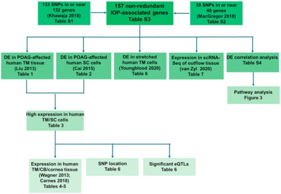 Experimental design for prioritization of intraocular pressure (IOP) associated genes. From two previously published genome-wide association studies (GWAS) [,], we identified 157 non-redundant IOP-associated genes, which we filtered and characterized for future functional analysis using the following criteria: (1) differential expression (DE) in primary open-angle glaucoma (POAG) affected trabecular meshwork (TM) tissue, (2) DE in POAG-affected Schlemm’s canal (SC) cells, (3) high expression in non-glaucomatous human TM and/or SC cells, (4) significant/high expression in human TM, ciliary body (CB), and cornea tissue, (5) single nucleotide polymorphism (SNP) location in regulatory regions, (6) significant expression quantitative trait loci (eQTL) for gene/SNP pairs, (7) DE in cyclically stretched human TM cells, (8) specific expression in cell clusters defined by single-cell RNA-sequencing (scRNA-Seq) of human conventional outflow tissue, and (9) pathway analysis of differential correlation pairs.