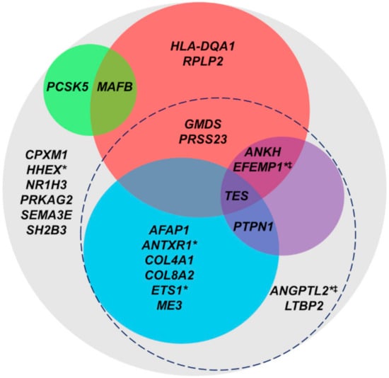As AH exits the TM, it enters the SC lumen, a vessel that has both vascular and lymphatic characteristics [,]. The endothelial cells comprising the inner wall of the SC share responsibility with the TM for outflow resistance and IOP regulation [,,,,,]. As a result, genes differentially expressed in the SC cells of POAG patients are likely involved in POAG pathogenesis. Therefore, the differential expression of the 157 IOP-associated genes was cross-referenced in previously published microarray data comparing gene expression in glaucomatous (n = 4) and non-glaucomatous (n = 4) SC cells []. There were eight genes that were upregulated (i.e., AFAP1, COL4A1, CPXM1, ETS1, PRKAG2, PTPN1, SH2B3, and TES), and nine that were downregulated (i.e., ANGPTL2, ANTXR1, HHEX, LTBP2, MAFB, ME3, NR1H3, PCSK5, and PRSS23) in POAG-affected SC cells (Table 2). Three of these genes (i.e., ANTXR1, LTBP2, and MAFB) had also been shown to be differentially expressed in POAG-affected human TM tissue (Figure 2, Table 1). Interestingly, the direction of differential expression for the 3 shared genes was opposite for TM tissue and SC cells.