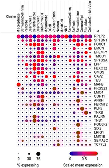 Genes expressed in single-cell RNA-sequencing (scRNA-Seq) cell clusters. Twenty-nine intraocular pressure-associated genes were specifically expressed in one or more of the 19 cell clusters defined by scRNA-Seq of human aqueous humor outflow tissue. Genes expressed in a high percentage of cells within a cluster are represented by a large dot while genes expressed in a low percentage of cells are represented by a small dot. Highly expressed genes appear more red while lowly expressed genes appear more blue. Cell clusters included Macrophage, Non-Myelinated Schwann Cell (SchwannCell-nmy), Pericyte, Trabecular Meshwork Beam Cell A, Ciliary Muscle, Trabecular Meshwork Beam Cell B, Cribiform Juxtacanalicular Trabecular Meshwork Cell (CribiformJCT), Melanocyte, B Cell, Vascular Endothelium (VascularEndo), Neuron, Mast Cell, NKT Cell, Myelinated Schwann Cell (SchwannCell-my), Schlemm’s Canal Endothelium (ScEndo), Schwalbe Line Cell, Corneal Epithelium (CornealEpi), Fibroblast, and Collector Channel/Aqueous Vein Endothelium (CollectorChnlAqVein).