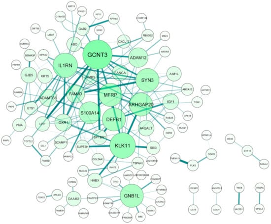 From this differential correlation analysis, we identified 295 significant differential correlation pairs (FDR ≤ 0.1) comprised of 201 genes (Supplemental Table S5). Of these 201 genes, 45 were IOP-associated genes. To better understand how these correlation pairs interacted, we created an interaction network for all correlation pairs using Cytoscape (Figure 4). Many of the 201 genes were involved in more than one correlation pair, with GCNT3, MUC20, KLK11, PLK5, and IL1RN being involved in the most number of correlation pairs.