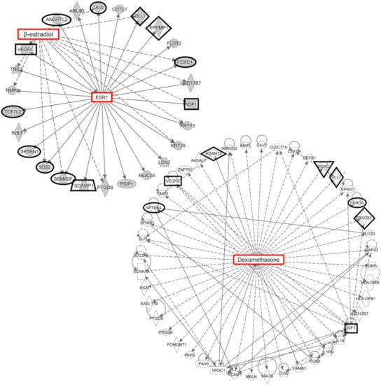 Functional networks composed of genes identified by differential correlational analysis. The 201 genes identified by differential correlation analysis comprised several functional networks. The top upstream regulator of the 201 genes identified by differential correlation analysis was β-estradiol with ESR1 mediating regulatory interactions between β-estradiol and 25 genes. Another top-upstream regulator was dexamethasone, which regulated several of the same genes as β-estradiol. Intraocular pressure-associated genes are indicated by a thick black outline.