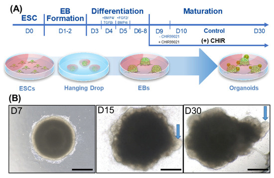 Embryoid bodies (EBs) were obtained using the hanging drop technique [12], as follows. After dissociating the ES-J1s with TE buffer, drops containing 4 × 105 cells/mL per 30 μL of maintenance medium were inoculated onto a petri-dish cover and cultured at 37 °C for 48 h under the above-described conditions. Then, the collected EBs were washed with 1× phosphate-buffered saline (PBS) and plated in 24-well plates for differentiation into otic-like organoids at 37 °C in a 5% CO2 humidified incubator. The Otic differentiation protocol was adapted from Koehler et al. (2014) and DeJonge et al. (2016). Briefly, before the onset of differentiation, the medium was replaced with ectodermal differentiation medium including 2% Matrigel. Then, on the second day of differentiation, nonneural ectoderm was induced by adding 10 ng/mL of recombinant BMP4 (Stemgent, Beltsville, MD, USA) and 1 μM of TGFβi (SB431542, Stemgent, Beltsville, MD, USA) to the cultured cells. On the third day, preplacodal ectoderm was induced by adding 25 ng/mL of FGF-2 (PeproTech, Rocky Hill, NJ, USA) and 1 μM of BMP4i (LDN-193189, Stemgent, Beltsville, MD, USA). The treated cells were cultured for 3 days, and the medium was replaced on day 9 with maturation medium containing 1% Matrigel with or without 3 µM of CHIR99021. After 48 h, a complete change in maturation media without Matrigel and CHIR99021 was performed. Half of the medium was replaced with maturation medium every other day until day 30. The differentiation procedure is illustrated in Figure 1A.