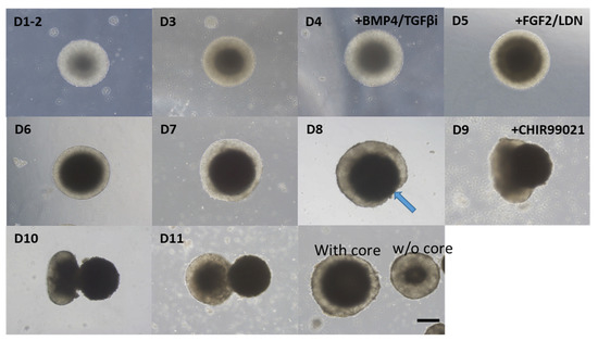 Enucleation of the central core during the maturation phase. Serial changes in a representative EB from day 1 (D1) to day 11 (D11) are shown. During the development of the organoid, the cellular density of the central part of the EB gradually increased, as indicated by the gradual darkening of the central part. Around day 8 (D8), thinning of the peripheral region was observed (arrow). Then, the central part protruded gradually from day 9 (D9) to day 11 (D11). Eventually, this central part (core) detached from the parent EB and formed a separate EB. Some EBs matured without undergoing enucleation. Enucleated EBs were smaller than nonenucleated EBs. Scale bar indicates 200 µm.