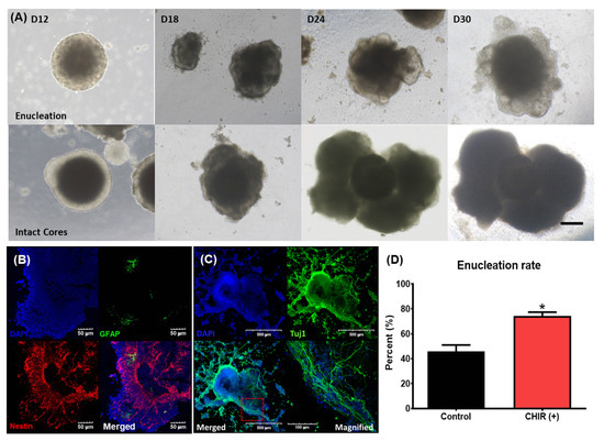 Different fates of EBs (with or without cores) and the effect of a Wnt agonist on enucleation. (A) Serial changes in two representative EBs from day 12 (D12) to day 30 (D30). The upper section shows the maturation of EBs after core enucleation. After core enucleation, protrusions around the surface started to develop and form otic organoids. The lower section shows the maturation of EBs with an intact core. These EBs gradually increased in size and developed into cell-rich organoids with multiple lobular projections. The scale bar in image (A) indicates 200 µm. Epifluorescence images of fully differentiated EBs (day 30) that did not undergo enucleation are shown in (B,C). (B) The distribution of GFAP- and nestin-positive cells throughout the whole organoid, suggesting that these organoids may have been neural structures. (C) Tuj-positive linear structures indicative of nerve fiber sprouting. The magnified image shows multiple linear structures spreading in the same direction. The scale bars in images (B,C) indicate different lengths. The application of CHIR, which is a Wnt agonist, altered the rate of enucleation. CHIR-treated EBs showed a higher rate of enucleation compared to control (no CHIR) EBs (D). (* p < 0.05).