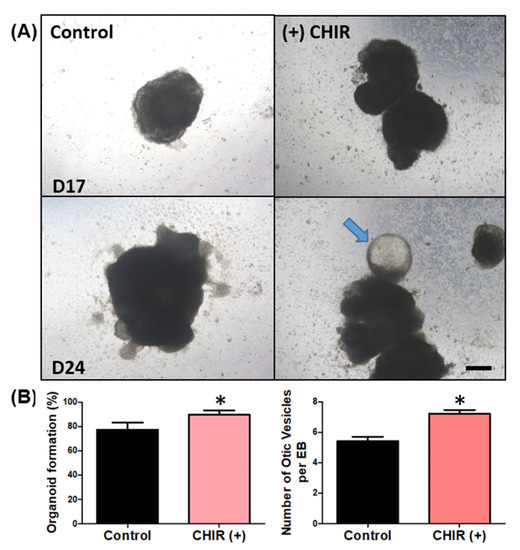 Wnt agonist (CHIR) application and possible otic organoids (cystic protrusions). The images in (A) show organoid differentiation at two time points: day 17 (D17) and day 24 (D24). The left column shows organoid differentiation without the Wnt agonist (CHIR), and the right column shows differentiation with CHIR. At D17, the control organoids had irregular surfaces but no definite protrusions, while the CHIR-treated EBs showed clearly protruding lesions around the surface. On D24, irregular surfaces started to develop into protruding lesions in the control organoids, while CHIR-treated EBs showed protrusions that were more enlarged with cystic organoids (arrow), resembling otic organoids. The scale bar in image (A) indicates 200 µm. We assessed the organoid formation rate and counted the number of organoids (vesicles) per EB. In the CHIR-treated group, the rate of organoid formation was significantly higher (B) and there were more organoids per EB (C). (* p < 0.05).