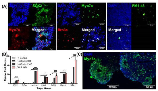 Epifluorescence analysis of organoids and the effect of a Wnt agonist (CHIR) on myosin VIIa expression. We conducted epifluorescence analysis of the organoids from enucleated EBs on differentiation day 30 to measure the hair cell markers, as demonstrated in (A). The organoids with mature protrusions were frozen and sectioned. The left image shows myosin VIIa- and Sox2-positive cells in an organoid. Cellular spaces were observed within the organoids. Most of these spaces were surrounded by myosin VIIa (red; inner ear hair cell marker)- and Sox2 (green; inner ear-supporting cell marker)-positive cells. The middle image shows the diffuse expression of myosin VIIa (red)-positive cells and Brn3c (green; another inner ear hair cell marker)-positive cells. Co-expression of myosin VIIa and Brn3c was also observed. The right image shows the expression of FM1-43, which is a marker for mechanoelectrical transduction. (B) The results of a RT-PCR analysis of gene expression in accordance with otic differentiation. The negative control ((−) Control) corresponds to EBs before differentiation, (+) Control 7D to EBs on differentiation day 7, (+) Control 14D to EBs on differentiation day 14, and CHIR 14D to EBs with CHIR on differentiation day 14. The graph shows statistically significant differences between CHIR 14D and other time points/conditions. The expression of Pax8 (otic precursor marker) and myosin VIIa (M7A) was significantly higher with CHIR compared to (+) Control 14D. The image in (C) shows two EBs after 30 days of differentiation with CHIR application. Increased expression of myosin VIIa (green; Myo7a)-positive cells was identified, suggesting enhancement of the otic differentiation process. The scale bars in images (A,C) indicate different lengths. (*** p < 0.001).