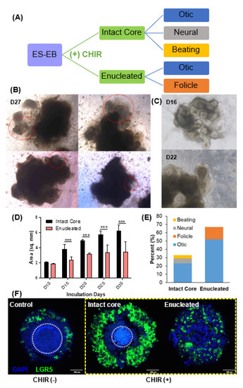 The difference between intact and enucleated EBs was also apparent several days after CHIR treatment. There was a statistically significant mean size difference of 2.10 ± 0.58 mm2 between the intact and enucleated EBs at day 15 until the end of the experiment on day 30 (Figure 6D). The difference in EB size was largely affected by the enucleation process, as shown by the disappearance of the core that can be found in the control and intact EBs (white encircled area). In Figure 6E, 75% formed otic vesicles out of all the EBs that developed organoids, 25% of which came from intact EBs, while 52% were from enucleated EBs. Intact EBs also generated 6% neural and 4% beating organoids, none of which appeared in enucleated EBs. Organoids resembling hair follicles appeared from enucleated EBs, which represented 15% of the total EBs observed. The difference in effect of Wnt activation was also compared by observing the expression of the Wnt target protein LGR5 at the start of maturation (D12), and it was found that the expression was highly elevated in CHIR-treated samples (Figure 6F, yellow dotted rectangle). LGR5 expression could be observed in the control (−) CHIR group, but CHIR-treated EBs showed higher LGR5 expression. Intact EBs showed a high expression of LGR5 only in the outer layer. Cells expressing LGR5 became evenly distributed within the EB after enucleation.