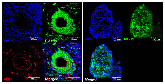 Structures that exhibited movement (Supplementary Materials Video S1) were harvested and stained for epifluorescence analysis (Figure 7). We performed epifluorescence analysis using phalloidin to stain F-actin and CTP1 to stain cardiac cells. Both F-actin and CTP1 were observed. Rich clusters of F-actin-positive cells surrounded the empty hollow spaces in the organoids, which appeared to be able to harbor fluid. CTP1 was observed in the cytoplasm of these F-actin-positive cellular structures, as was TAGLN, which reflects actin cross-linking. Thus, the moving/contracting structures resembled cardiac structures, indicating that it may be possible to develop cardiac organoids. We termed these organoids ‘beating’ organoids as they highly resembled cardiac structures. Without application of the Wnt agonist, no beating organoids were observed. However, more than 30% of the Wnt agonist-treated EBs contained these beating organoids, unexpectedly indicating differentiation into cardiac lineage. Thus, while we observed increased differentiation into multiple stacked layers of myosin VIIa-positive cells, the presence of the beating organoids confirmed the initiation of differentiation into other lineages.
