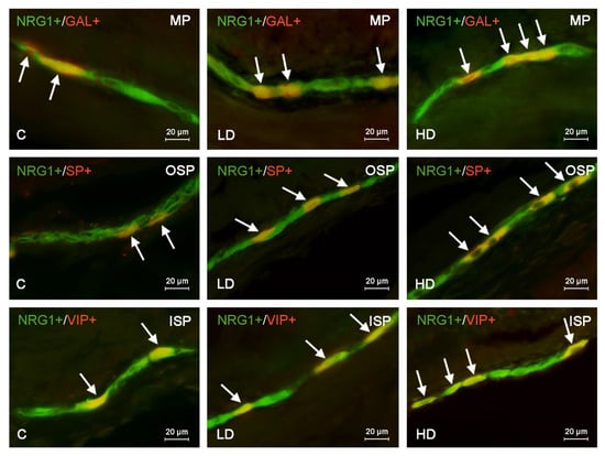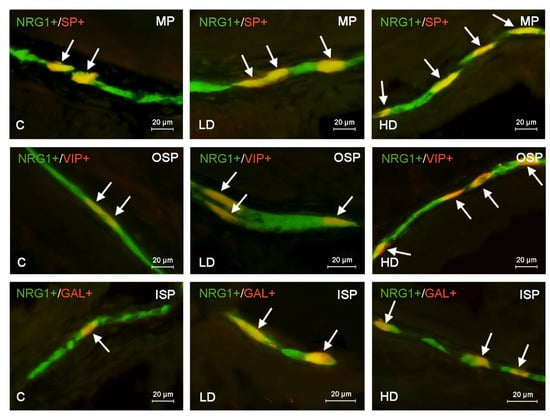 Distribution pattern of nerve cells immunoreactive to Neuregulin 1 (NRG1) and other neuronal substances studied—galanin (GAL), substance P (SP) or vasoactive intestinal polypeptide (VIP)—in the muscular plexus (MP), outer submucous plexus (OSP) or inner submucous plexus (ISP) in the porcine descending colon under physiological conditions (C) and in the low dose (LD) group and the high dose (HD) group. The pictures are the result of the overlap of both stainings. Neurons immunoreactive for both NRG1 and other of the neuronal substances studied are indicated with arrows.