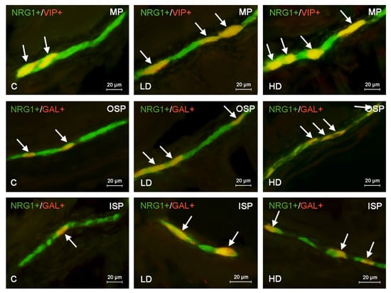 Distribution pattern of nerve cells immunoreactive to Neuregulin 1 (NRG1) and other neuronal substance studied—galanin (GAL, substance P (SP) or vasoactive intestinal polypeptide (VIP)—in the muscular plexus (MP), outer submucous plexus (OSP) or inner submucous plexus (ISP) in the porcine ascending colon under physiological conditions (C) and in the low dose (LD) group and the high dose (HD) group. The pictures are the result of the overlap of both stainings. Neurons immunoreactive for both NRG1 and other of the neuronal substances studied are indicated with arrows.