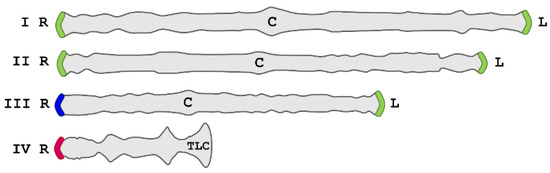 Chironomus riparius, also known as Chironomus thummi, possesses one of these noncanonical telomeres consisting of 176-bp-long tandemly repeats at their chromosome ends. Early analysis of its telomeres showed the existence of transcriptional activity that could be detected after thermal stress as a giant telomeric puff remarkably observed in the right telomere of chromosome 3 (hereinafter ‘III-R’). Activation of transcription under heat shock was also detected in other telomeres but to a lesser extent [19]. Later, it was shown that other stress conditions, such as hypoxia and chemical stress, can also induce the transcriptional activity of these telomeres [20,21,22]. The isolation and identification of repeated sequences allowed for examination of the putative molecular basis of transcriptional activity [14]. The sequences are not identical in all the telomeres though they show a high conservation rate, near 90% of sequence conservation [23]. Three different subfamilies of telomeric sequences, named TsA, TsB, and TsC, were described, showing a specific location in the telomeres [23]. TsA is present only in the III-R telomere, while TsC is only present in the IV-R telomere. TsB is the most widespread, being shared by the remaining telomeres except the telocentric end of chromosome 4 (IV-L) (Figure 1). According to the above, it was recognised that TsA is highly overexpressed under thermal stress conditions whereas TsB also showed transcription but with lower activity. No transcription has been detected for TsC sequences.