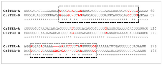 Sequence alignment of monomeric units of the telomeric CriTER-A and CriTER-B ncRNAs. Pairwise sequence alignments performed with EMBOSS Water Web services (default options, https://www.ebi.ac.uk/Tools/psa/emboss_water/, accessed on: 25 August 2021). Sequence variations are denoted in red. Two regions accumulating most of the dissimilarities are highlighted with a dashed line box.