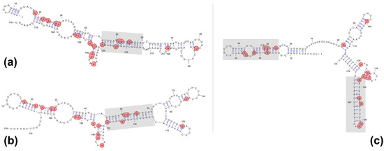 Minimum free energy (MFE) structures predicted with RNAStructure 6.0.1. (a) CriTER-A MFE at 20 °C; (b) CriTER-A MFE at 35 °C; (c) CriTER-B MFE. No significant temperature-dependent changes are found in MFE structures predicted for CriTER-B. Sequence variations are denoted in red. Regions with high base pairing probabilities and highly prevalent in the suboptimal spaces are shadowed (see Supplementary Materials).