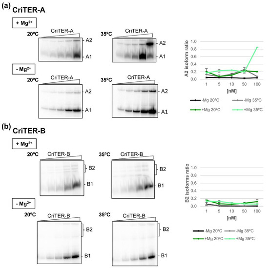 Importantly, increasing the temperature up to 35 °C promoted a significant increase in the proportion of the A2 conformation of ~4-fold (Figure 4) in a Mg2+-dependent way (Figure 4). No differences in the B1:B2 ratio were detected at 35 °C either in the absence or presence of Mg2+ (Figure 4b). However, the structural heterogeneity of B2 isoforms was reduced in the absence of divalent cations, suggesting the strong dependence on Mg2+ for the acquisition of suboptimal conformations in the CriTER-B variant (Figure 4b). Together, these results suggest that CriTER-A could work as a thermometer by changing its conformation in response to thermal stress conditions.