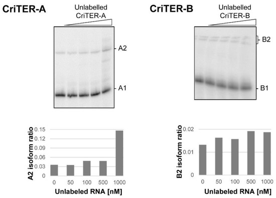 The existence of slow migrating isoforms could be the result of different structural conformations, but it also could be due to the establishment of intermolecular interactions, leading to the formation of homodimeric complexes in a concentration-dependent manner. In order to test this possibility, 32P-internally labelled CriTER-A and CriTER-B transcripts were subjected to competition assays with the respective unlabelled transcripts. These assays were performed in the absence of divalent cations at 20 °C (Figure 5). Importantly, the increase in the concentration of the competitor did not interfere with the formation of the A2 and B2 isoforms, respectively. Instead, high concentrations of the unlabelled CriTER-A transcript induced an evident improvement in the formation of the A2 isoform (Figure 5), in good concordance with previous results (Figure 4a) and confirming that high concentrations of the CriTER-A RNA promote a displacement in the structural equilibrium toward the A2 isoform. No significant changes could be detected in the ratio of the B2 isoform for the CriTER-B transcript (Figure 5), pointing again to the structural homogeneity previously noted for this variant (Figure 4b). All these data support the existence of different structural variants for transcripts CriTER-A and CriTER-B, ruling out the occurrence of intermolecular homodimers.