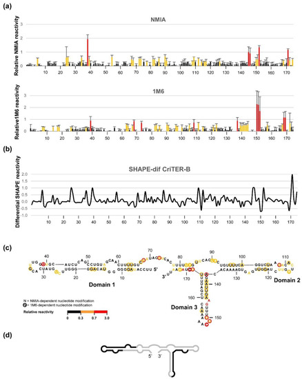 SHAPE analysis of CriTER-A and CriTER-B folding was performed essentially as previously described [29,33]. For this purpose, a self-folding cassette consisting of a 28 nts RNA sequence, which theoretically does not interfere with the folding of the RNA constructs, was placed at the 3′ end of each RNA.